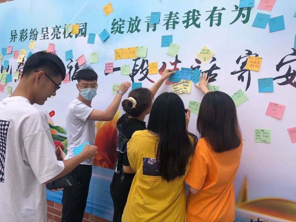 学生们来到e座教学楼门前,在“浓浓电商集祈福,一段佳话寄安康”前留言祈福。
