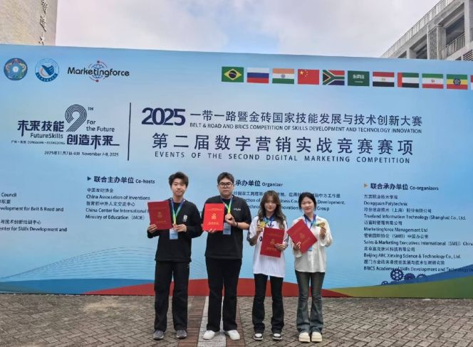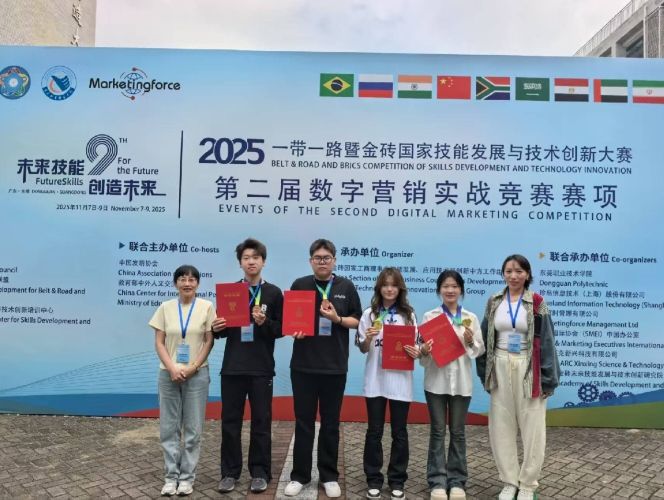 2025年11月8日,2025一带一路暨金砖国家技能发展与技术创新大赛之第二届数字营销实战竞赛全国总决赛在广东东莞职业技术学院圆满落幕。我校参赛团队凭借出色的数字营销实战能力与创新思维,在激烈角逐中脱颖而出,最终斩获一金一铜的优异成绩,展现了我校在数字营销领域扎实的教学成果与学生的综合素养。