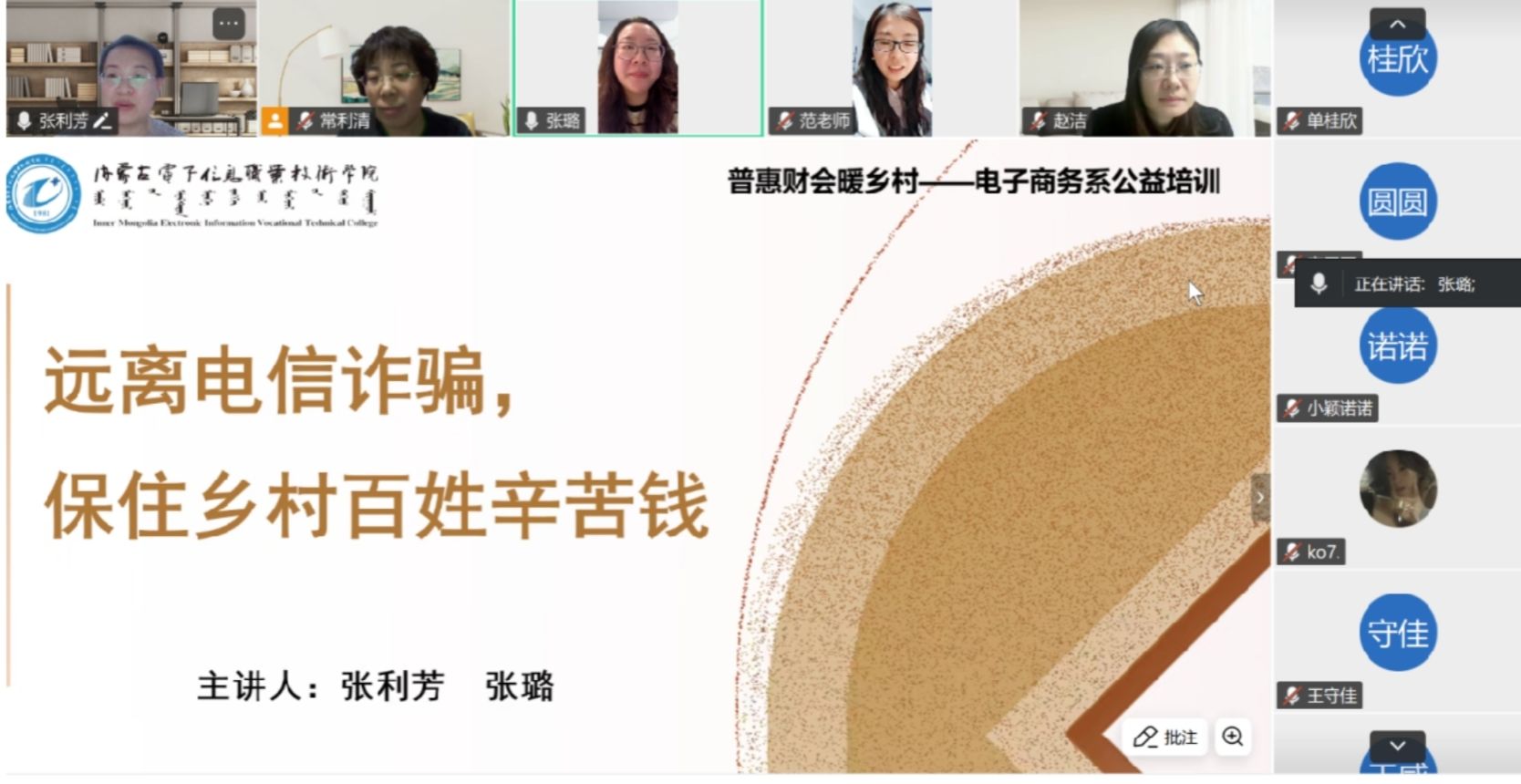 11月19日,电子商务系教师实践团队,以“云端课堂”形式为包头市土默特右旗海子乡百姓开展金融知识普及培训。针对乡村老年村民出行不便、青壮年多外出务工的特点,团队将线下宣讲转为线上直播,聚焦“远离电信诈骗”“读懂征信”“科学家庭理财”三大核心主题,用接地气的方式送上金融知识盛宴。