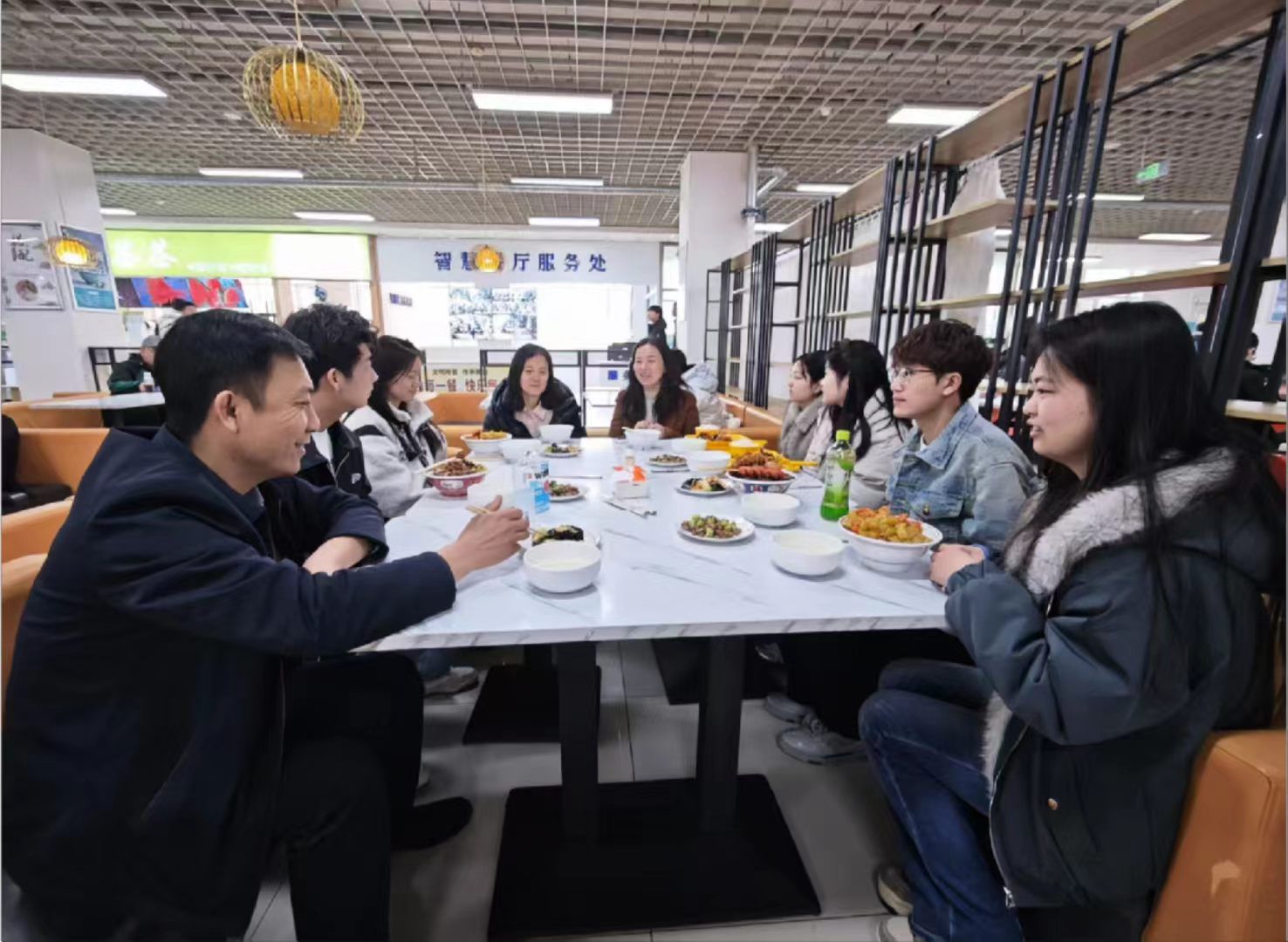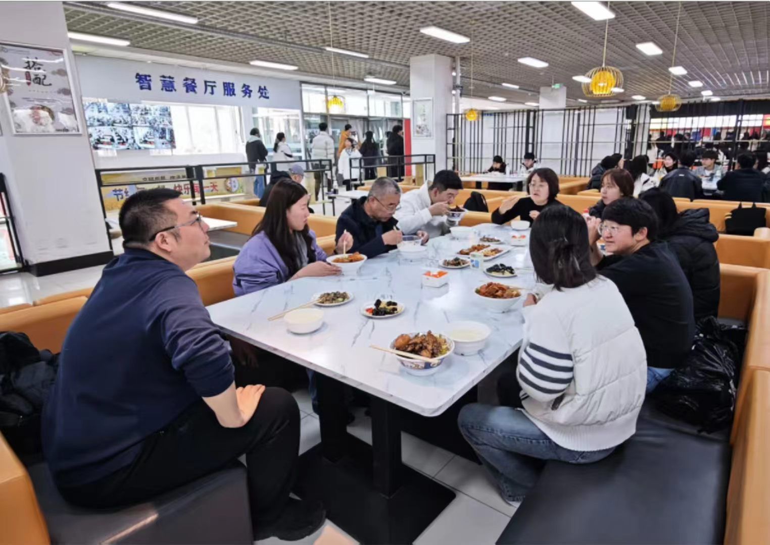 陪餐现场暖意融融,校领导一行与电子商务系同学一同排队取餐,全程体验学生日常就餐流程。用餐期间,校领导与学生们围坐一桌,语气温和亲切,详细询问大家对食堂饭菜口味、菜品质量、餐食价格的真实反馈,耐心倾听同学们在餐饮服务、就餐环境、日常管理等方面的意见建议,现场互动频繁、氛围温馨融洽。