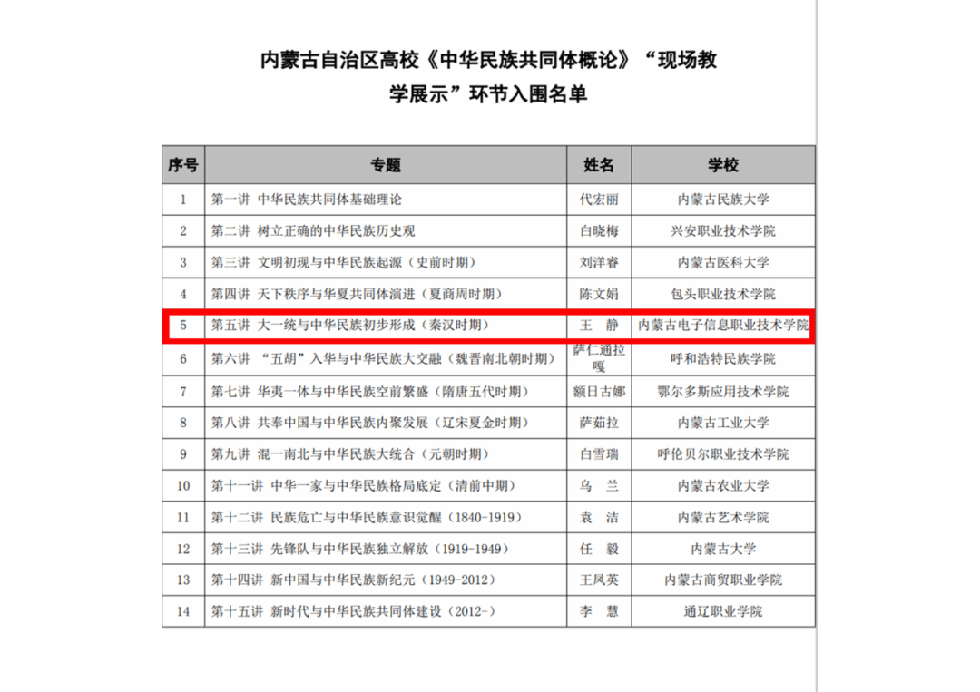 7月5日至6日,由自治区教育厅、自治区民族事务委员会主办,内蒙古医科大学承办的“内蒙古自治区高校《中华民族共同体概论》教学专题研讨会暨课程教学展示活动”成功举行。我校马克思主义教学部选派的王静老师7月5日参加教学展示取得优异成绩。