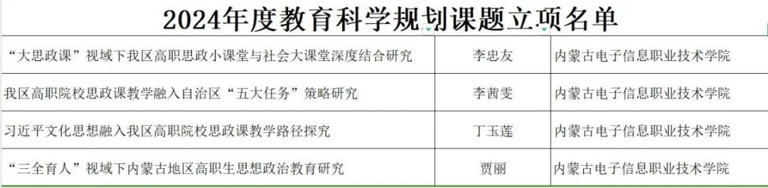 近日,内蒙古自治区教育科学“十四五”规划2024年度课题评审结果公示结束,马克思主义教学部获批4项内蒙古自治区教育科学“十四五”规划课题。