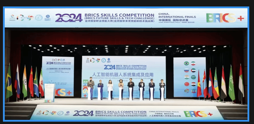 李春燕、林福利、崔雪艳、林民、陈军统、李晓亮、Hà Toàn Thắng、Ivanishchev Vitalii共同启动2024金砖国家职业技能大赛“人工智能机器人系统集成及应用”赛项国际总决赛。林民宣布总决赛正式开幕。