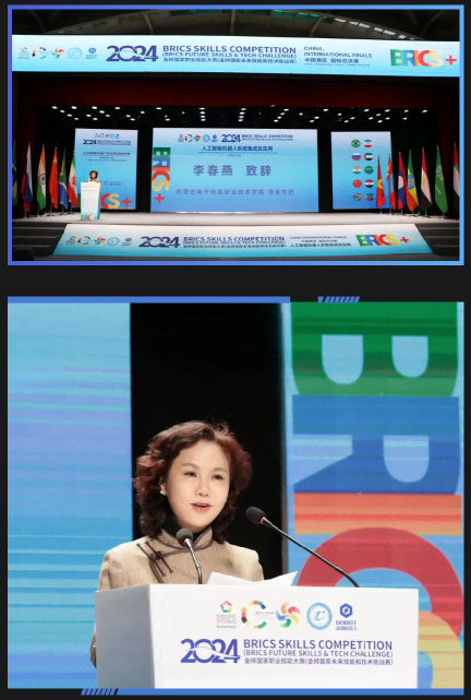 开幕式上,李春燕在致辞中介绍了学院在专业建设、人才培养、校企合作、社会服务等方面取得的丰硕成果和作出的突出贡献。她指出,学院将全力做好组织安排和服务保障工作,确保大赛顺利进行,并表达了通过本次大赛进一步加强金砖各国职业院校间的合作交流,共同促进新技术快速发展的美好愿望。