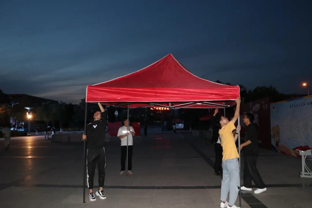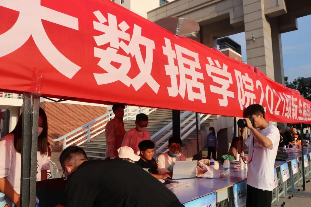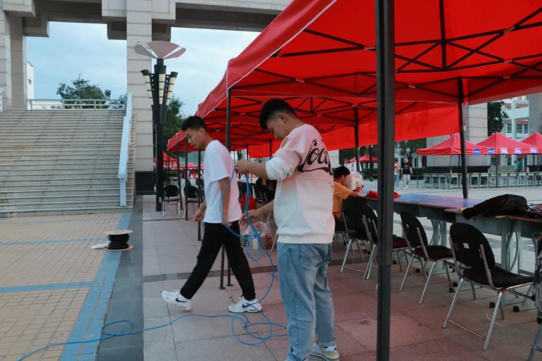 现场布置、协调组的志愿者们正在准备桌椅、帐篷等物资,去往新生接待处张贴“软件与大数据学院2021级新生接待处”条幅,并接通电路及网络,默默保障着迎新系统和软件的正常使用。