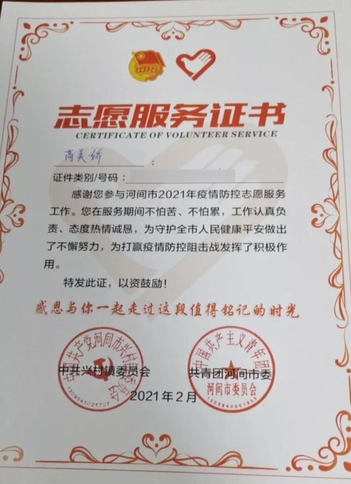 我的家乡在河北省河间市兴村镇南八里庄村,在此次暑假期间突然反弹的疫情让各村村委会不得不重视,2021年8月6日我报名参与村支部疫情防控志愿者活动,所有进村人员必须接受检查,扫码测体温,查看进出人员行程码、健康码,来自风险地区的人员进行上报检查,并提醒所有进出人员必须佩戴口罩。此次志愿活动也得到了家乡村民的一致好评,并带动了其他人志愿服务的积极性,一同为家乡做贡献。