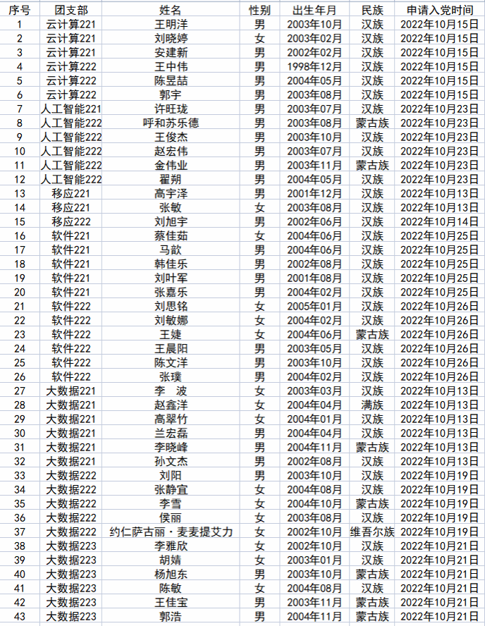 软件与大数据学院于4月13日-4月15日期间组织各团支部陆续开展“推优入党”大会,本次大会共推荐43名入党积极分子,名单公示如下:
