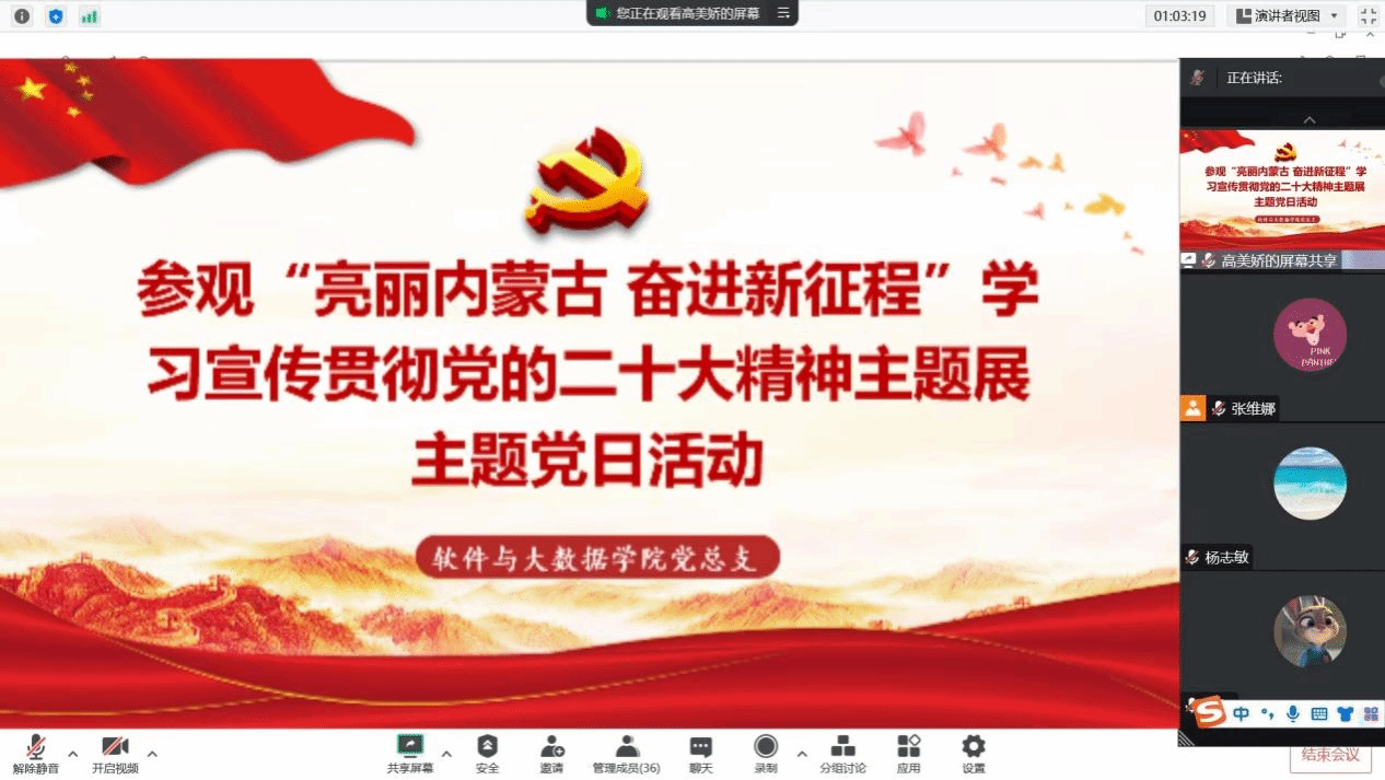 为深入学习宣传贯彻党的二十大,切实把思想和行动统一到以习近平同志为核心的党中央决策部署上来,把力量凝聚到党的二十大提出的新目标新任务新要求上来,埋头苦干、奋勇争先,全力推动二十大精神落地生根、开花结果,软件与大数据学院党总支于2022年12月22日下午,线上组织观看“亮丽内蒙古 奋进新征程”学习宣传贯彻党的二十大精神主题展党日活动,全体党员教师和党外知识分子参加。