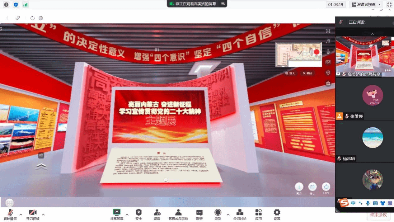活动开始后,大家跟随讲解在线上进行观展。展览紧紧围绕党的二十大的主题,运用图片图表、影像视频、展品模型、场景演示、多媒体查询等多项展览要素,通过直观、形象、生动的展览形式,展示了新时代十年的伟大变革,阐释了习近平新时代中国特色社会主义思想的世界观方法论和新时代新征程党的使命任务,解读了全面建设社会主义现代化国家的目标任务和重大决策部署,为大家提供了学习党的二十大精神的生动教材。