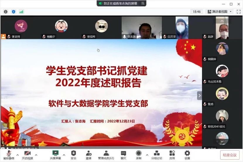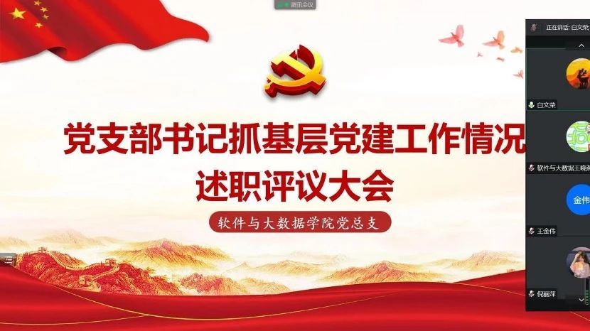 为深入学习宣传贯彻党的二十大精神,坚持和加强党的全面领导,夯实基层党建工作,落实管党治党政治责任,推进基层党建工作向纵深延伸,进一步落实学校党委的工作部署,软件与大数据学院党总支于2022年12月22日下午,线上召开党支部书记抓基层党建工作述职评议大会。本次会议由学院党总支书记杨志敏主持,全体党员以及教师和学生代表参会。