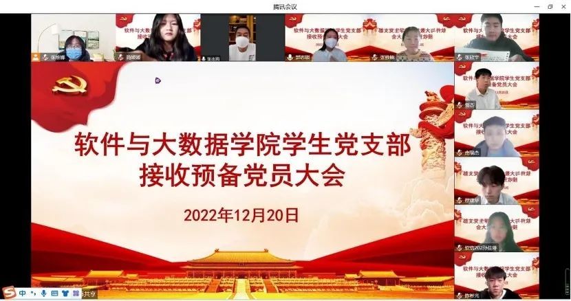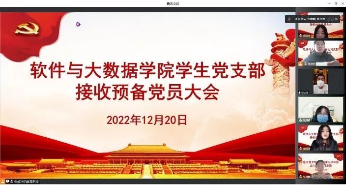 为进一步加强基层党组织队伍建设,吸收优秀青年力量加入到党员队伍中来,软件与大数据学院学生党支部于12月20日下午,在线上召开了接收预备党员大会,会议由党总支副书记兼学生党支部书记张志海主持,学生党支部全体党员及36期20名发展对象参会。