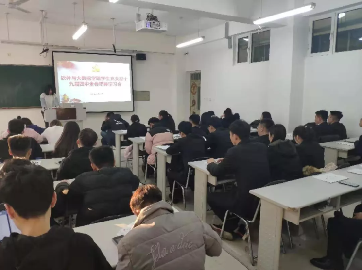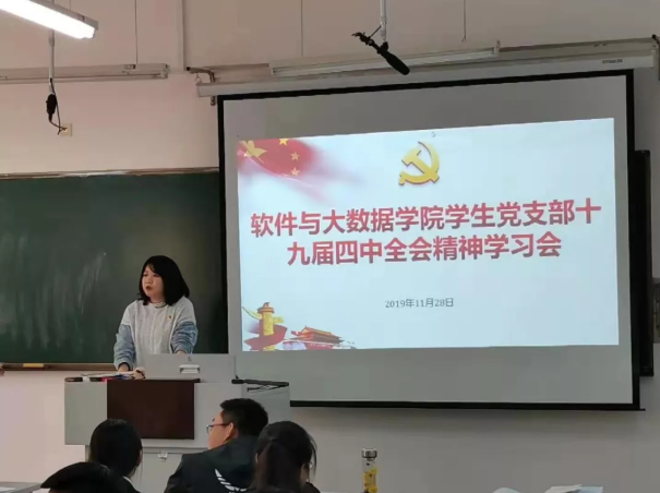 为深入贯彻习近平新时代中国特色社会主义思想,切实增强党员的思想政治素质和政治理论基础,提高党员的党性修养,软件与大数据学院学生党支部于11月28日下午在A110教室开展“不忘初心、牢记使命”主题教育学习会,会上集体学习了党的十九届四中全会精神。本次学习会由我院学生党支部书记李茜雯主持,学生党支部全体党员参加。