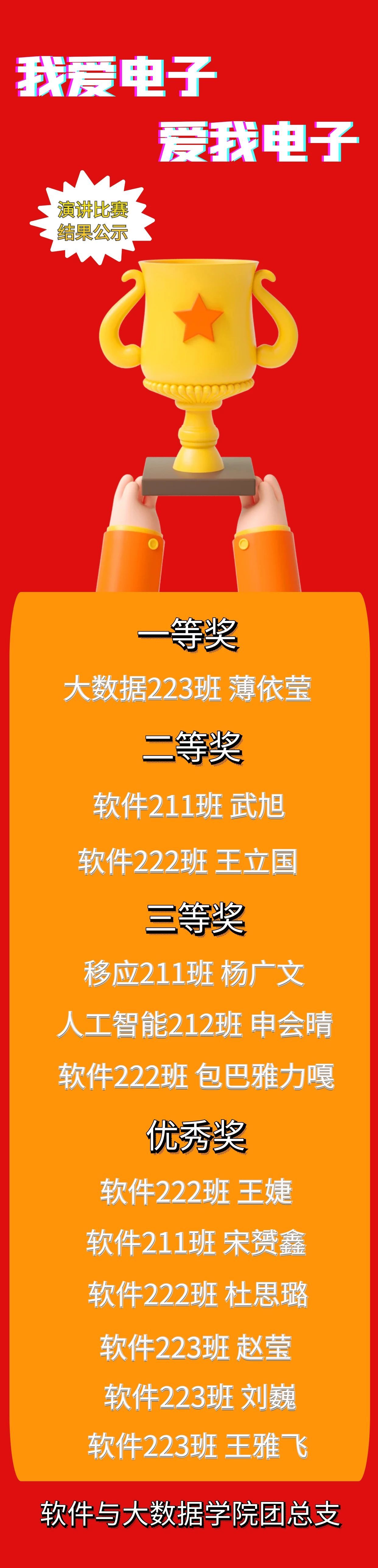 孔子曰:“仁者爱人”,只有懂得爱的人才会懂得珍惜,才会善待自己,善待他人。进一步培养大学生的爱党爱国爱校情怀,鼓舞当代大学生树立远大的理想,努力奋斗,肩负时代重任,践行成功素质教育理念。软件与大数据学院团总支于2023年3月21日在创业园三楼开展“我爱电子、爱我电子”主题演讲比赛。