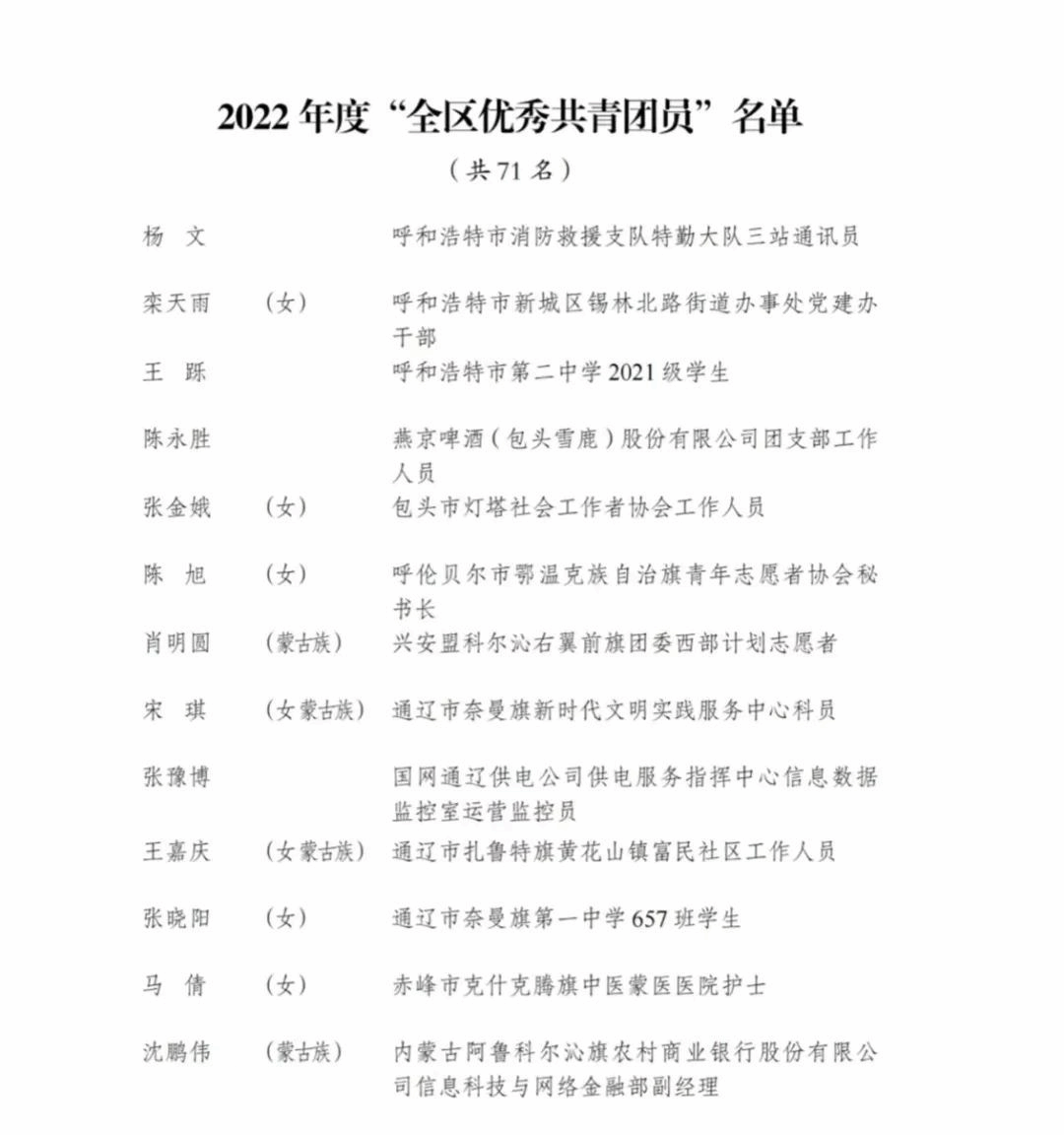 近日,内蒙古自治区团委作出表彰决定,授予70个团组织全区五四红旗团委(团支部)称号;授予71名同志全区优秀共青团员称号;授予59名同志全区优秀共青团干部称号。