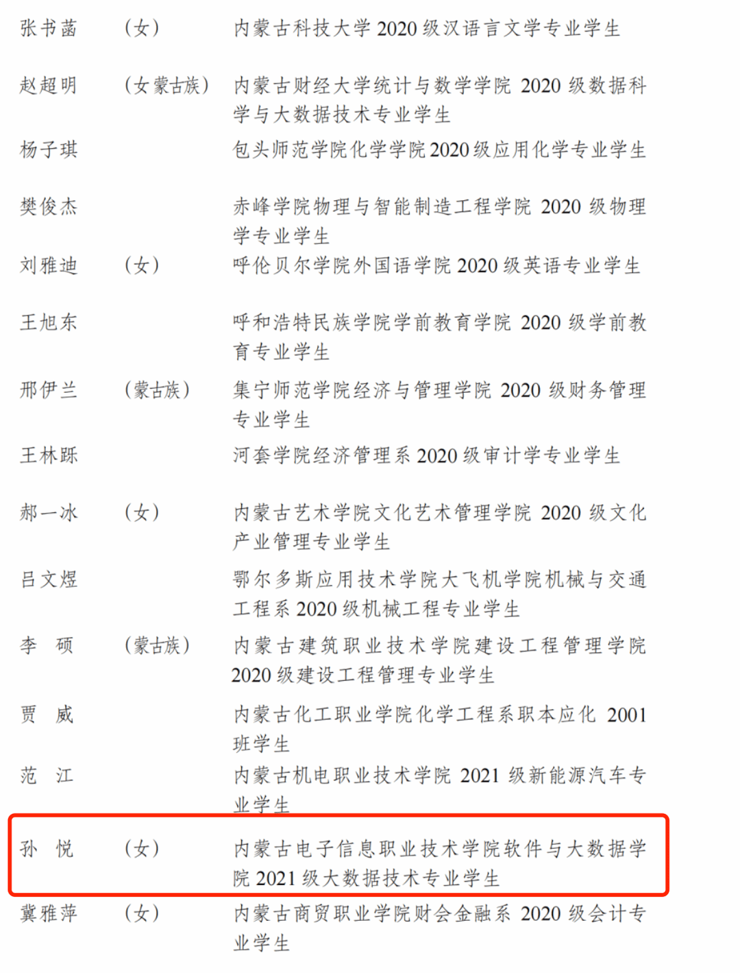 我院2021级大数据技术专业学生孙悦被授予“全区优秀共青团员”荣誉称号。