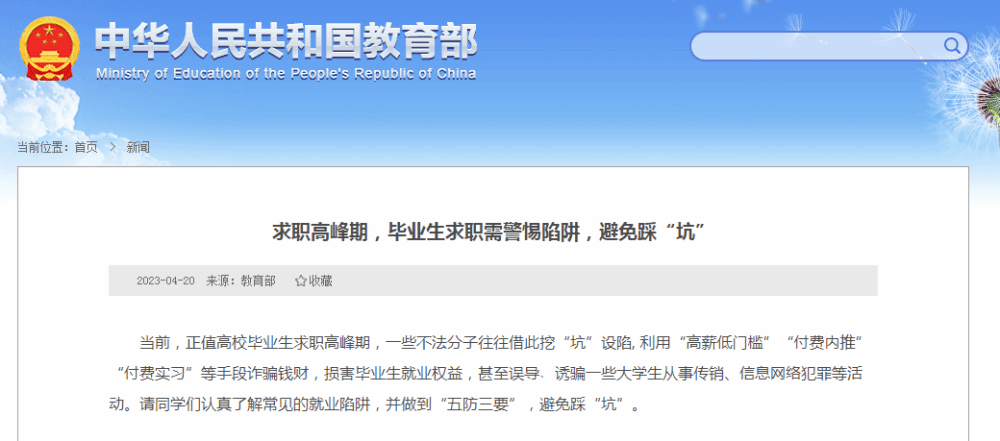 教育部指出,求职中要提高防范意识,“五防”主动避开陷阱——