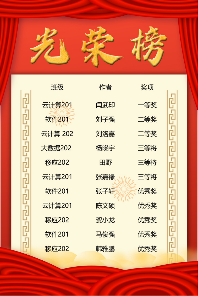 经过了作品收集以及评选,本次“携手禁烟·共创文明”禁烟创意海报比赛圆满结束。本次大赛由软件与大数据学院团总支书记李茜雯、共青团辅导员郭凯琪以及学生主席团担任评委,共评选出一等奖一名,二等奖二名,三等奖三名,优秀奖五名现予以公示: