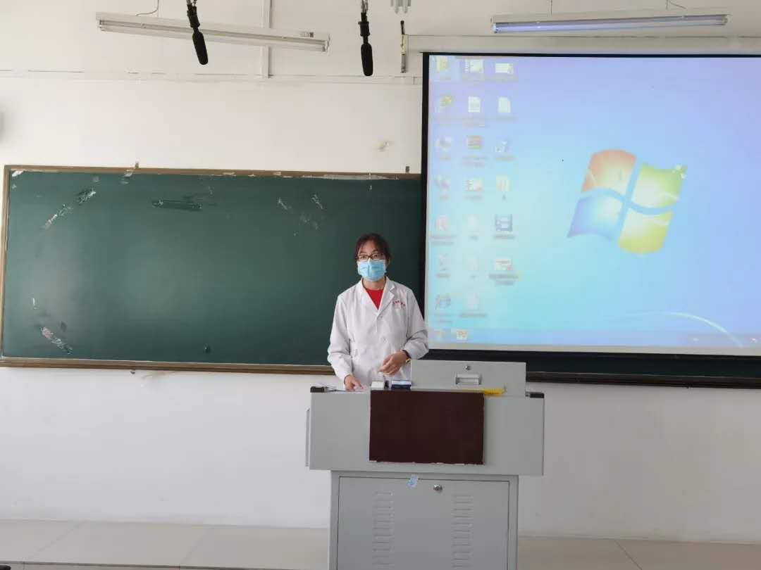 随后,我校后勤管理处医务室尹昱医师为与会人员开展了个人防护相关知识及消杀用品使用常识的讲座。尹老师先向大家展示了一次性医用口罩的正确佩戴方法及七步洗手法,提醒大家无论在校内外都要注意个人防护。接着详细介绍了区域消毒方法、室内化学消毒剂、紫外线消毒灯等消杀产品的使用方法、消毒剂正确配比比例及使用注意事项等知识,为我院复工复学准备工作提供了科学的指导。