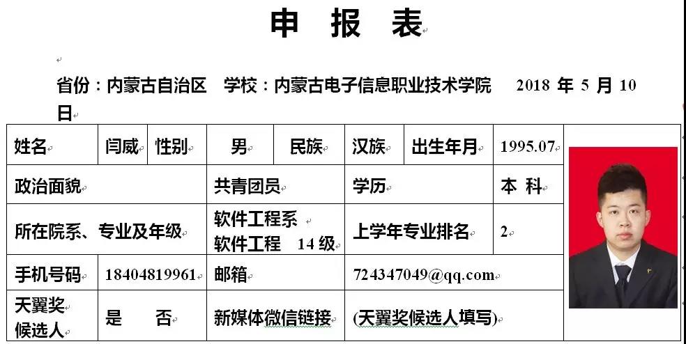 闫威同学是内蒙古电子信息职业技术学院软件工程系软件工程专业的2014级在校生。在校期间,他立足于自身专业,勤奋学习,努力刻苦,各项专业课程和相关技能都名列前茅,多次获得国家励志奖学金、企业奖学金、校级特等奖学金、一等奖学金。由于家庭“工匠精神”的熏陶,还自学了涉及到电路、机械、基础设施维护、基础用电器维修、各类工具的使用等相关技能。