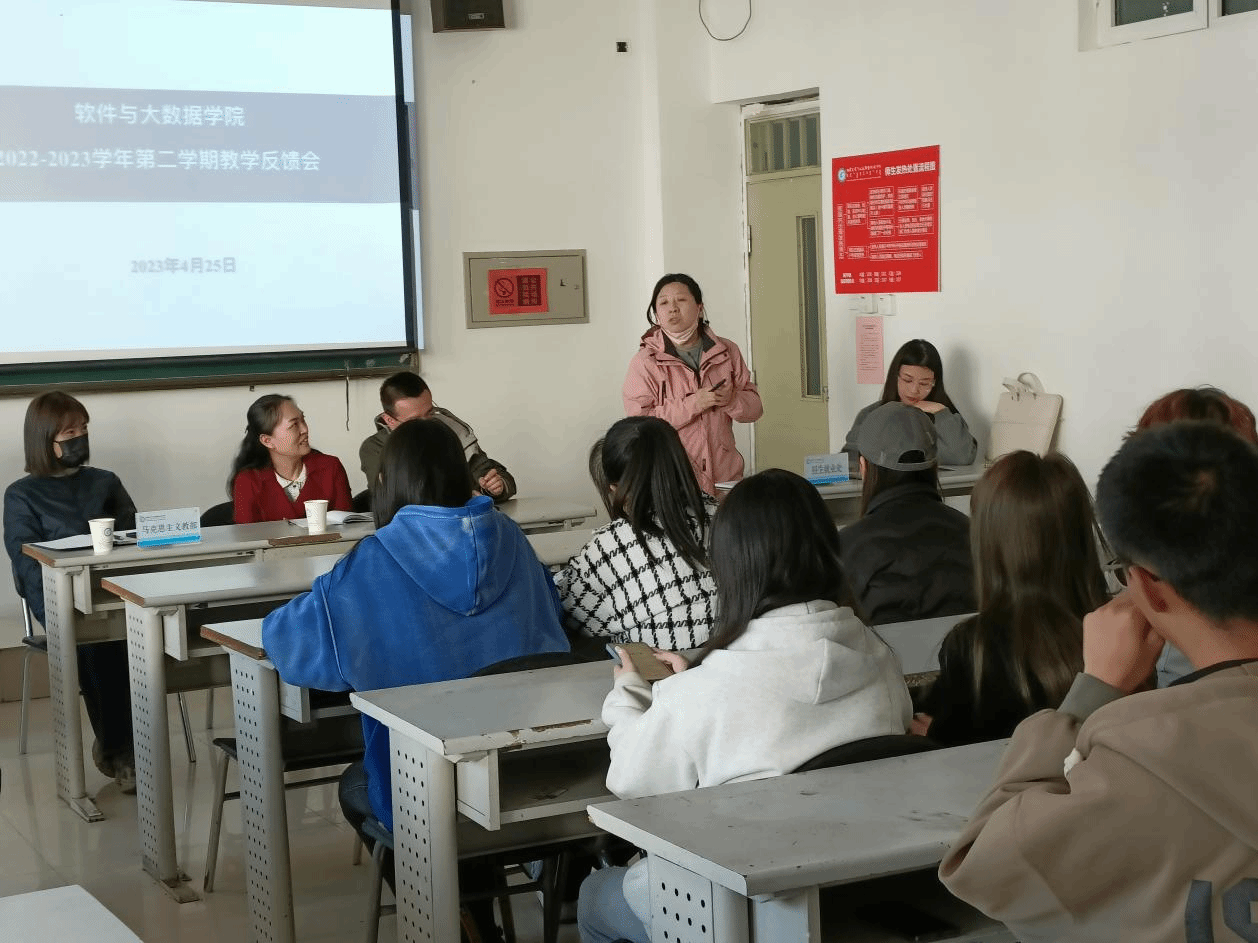 为增强师生之间的交流,全面及时了解教学情况,有针对性地采取措施,以进一步提高教学质量,形成教与学的良性互动。2023年4月25日下午16:20,软件与大数据学院组织召开2022-2023学年第二学期教学反馈会。会议由教务科吕倩主持,教学质量监控中心杨打生、马克思主义教学部刘杰、招生就业处焦佼、通识教育部周楠、软件与大数据学院移动应用开发专业负责人杨东霞、云计算技术与应用专业负责人哈里白以及各个班级的学委参加会议。