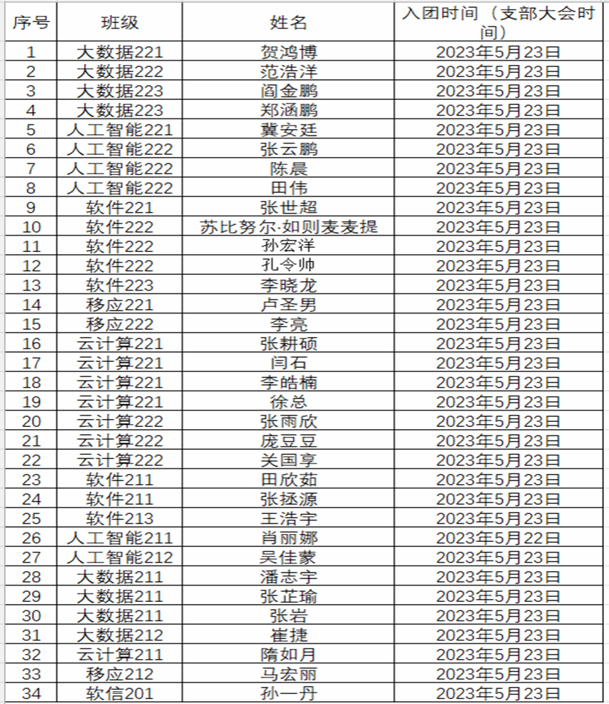 共青团是党的助手和后备军,是党领导的先进青年的群众组织。做好团员发展工作,是团的性质和任务决定的。及时吸收新团员是对要求进步的青年的一种鼓舞和鞭策,能激发青年大学生的政治热情和上进心。根据《中国共产主义青年团章程》相关规定及《新时代共青团员先进性评价指导大纲》(中青办发〔2020〕3 号)文件精神,进一步加强我校共青团队伍的组织建设和思想建设,增强团组织的战斗力和凝聚力,为我校共青团组织注入新的活力,软件与大数据学院各团支部召开团员大会,共推荐34名入团积极分子,名单公示如下: