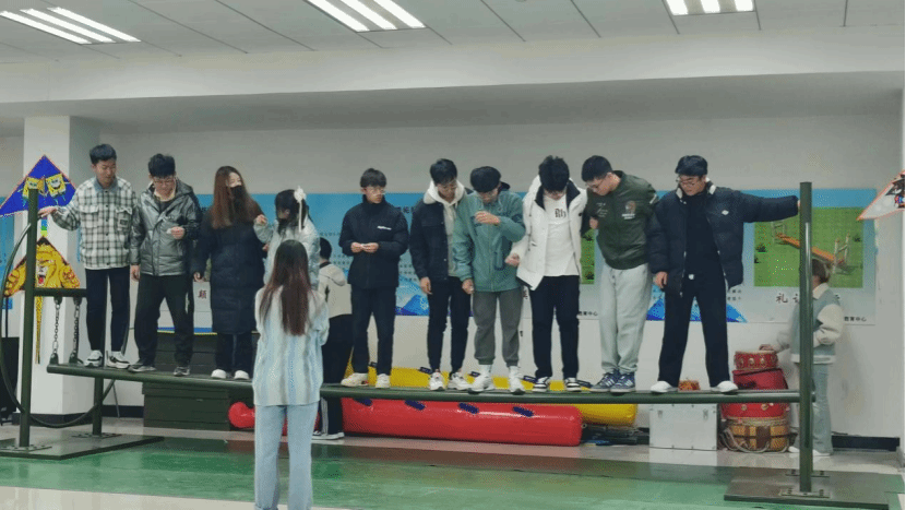 然后平衡板游戏。这些队员们需要通过抽签的方式从盒子里抽取一个0-9的随机数,然后利用肢体语言按照随机数从小到大的顺序排列。如果有人掉下平衡板,那么整个活动的总用时将会增加5秒。在游戏进行中,指导员不断地鼓励同学们发挥团队精神,互相帮助。整个活动现场充满了欢声笑语和青春洋溢的身影。