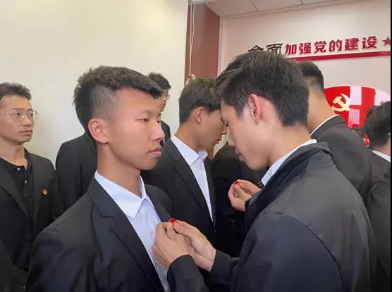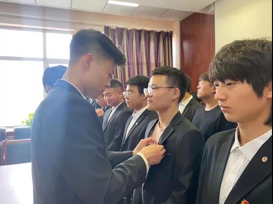 在庄严的国歌声中,本次入团宣誓仪式正式开始。本期共有19名学生顺利加入团组织,首先,主持人宣读新团员名单,随后由学院学生会组织部成员为新团员佩戴团徽。