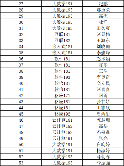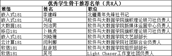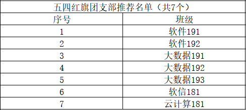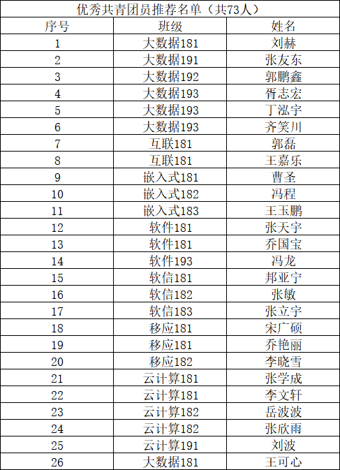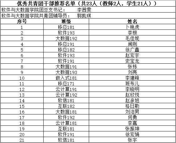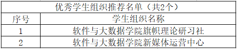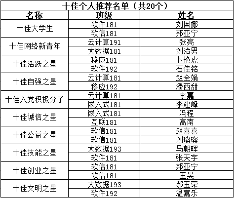 软件与大数据学院团总支现将评选推荐结果进行公示,公示期为2020年4月26日至4月30日,如对推荐名单有异议,请在公示期内向学院提出。