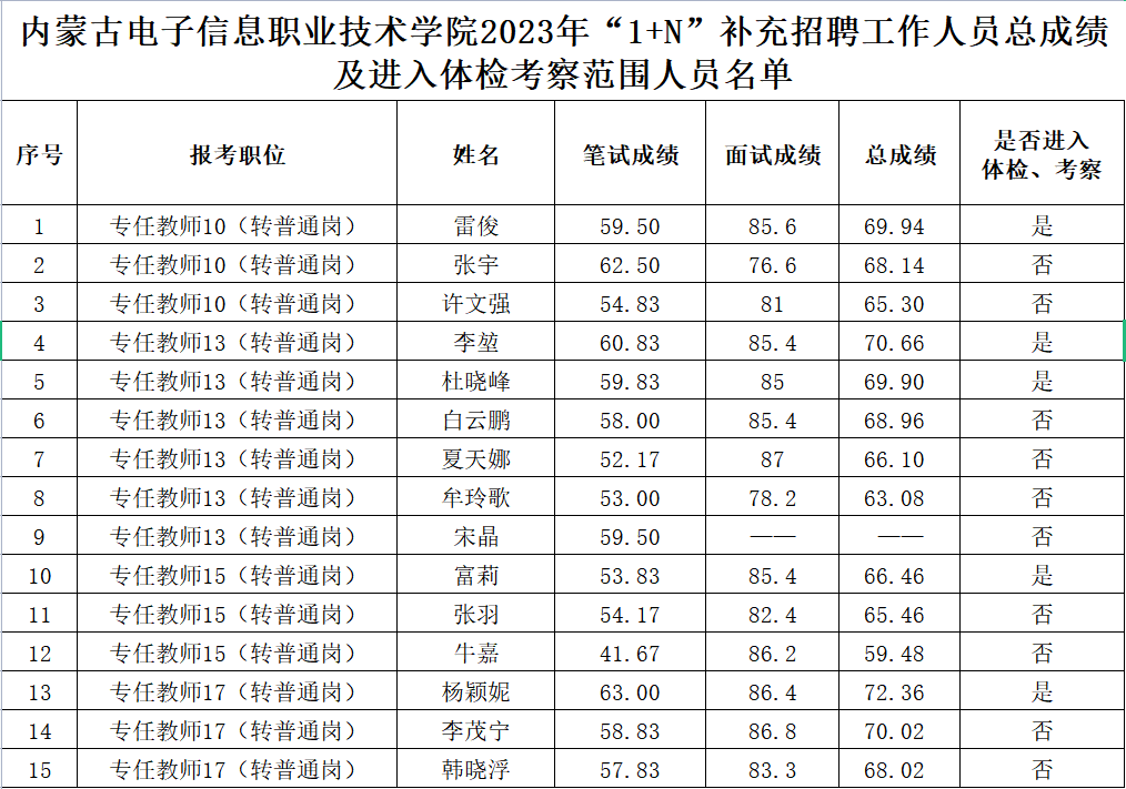 根据《2023年内蒙古自治区事业单位“1+N”补充招聘工作人员公告》和《内蒙古电子信息职业技术学院2023年度事业单位公开招聘工作人员公告》要求,我校补充招聘工作已完成网上报名、资格初审、资格复审、面试等环节,现对内蒙古电子信息职业技术学院2023年“1+N”补充招聘工作人员总成绩及进入体检考察范围人员予以公布(名单见附件),请进入体检范围考生联系电话保持畅通,等待体检通知。体检合格人员进入考察环节,考察事宜另行通知。