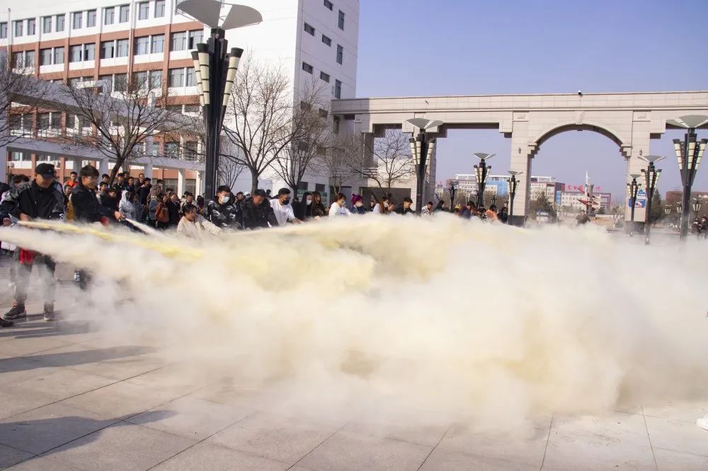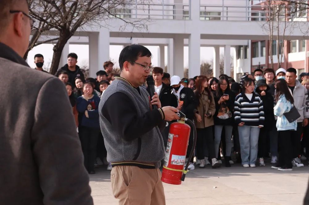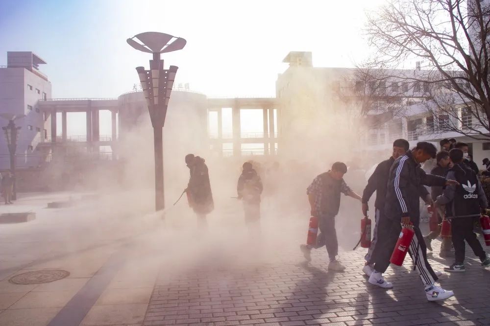 随后在教学楼群中间小广场,由学校保卫处杜彦彪和崔发旺老师对大一新生进行灭火器使用的现场教学指导,各班级消防员和安全员分两批次40余人现场实践使用灭火器。