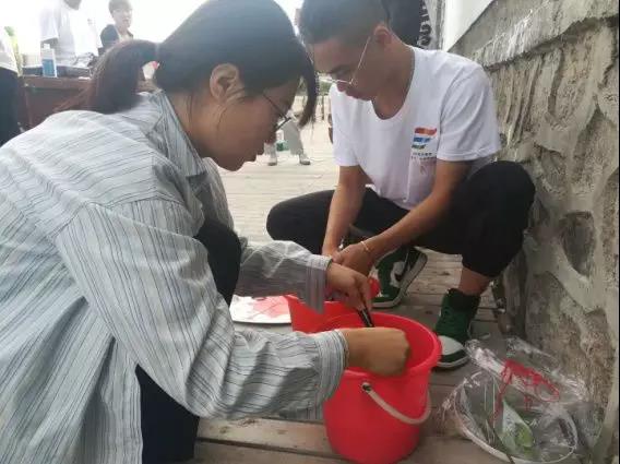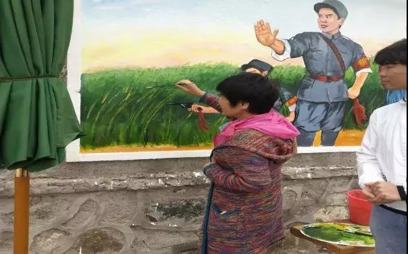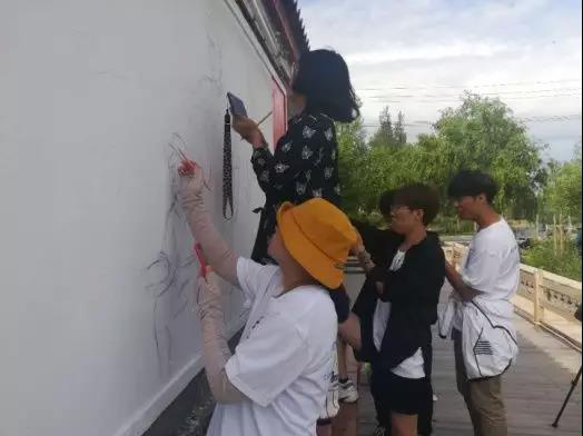 团队一起为哈拉盖图农牧场画着反映当时时代特征的墙体彩绘《沙家浜》,团队成员们一起认真讨论主题内容,精心勾勒每一个人物和背景的线条,调色、配色、起笔、造型等等,都在以精益求精的工匠精神来对待这项文化和艺术并重的实践活动。一次次的上色勾勒,人物和场景渐趋完善。团队成员看着精心绘就的成果,会心的笑和满足的幸福感,让团队成员们都感到,能够用专业技能为小镇的文化建设增添色彩,为基层做一点事的社会实践活动极有教育意义。