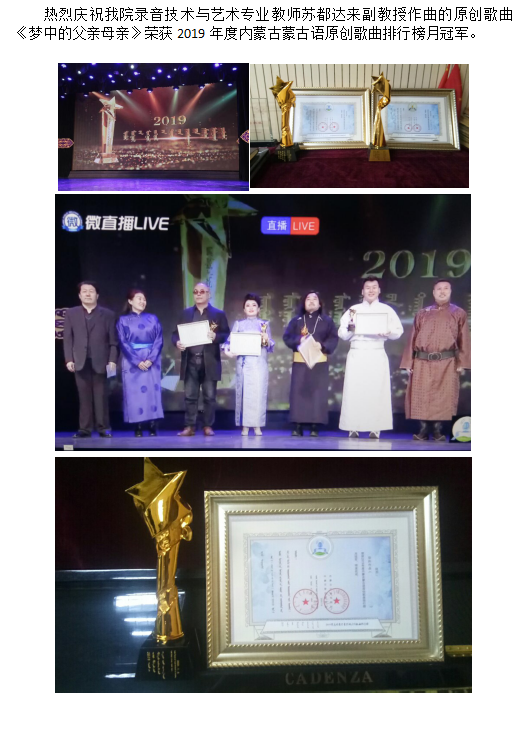 我院苏都达来副教授荣获2019年度内蒙古蒙古语原创歌曲排行榜月冠军