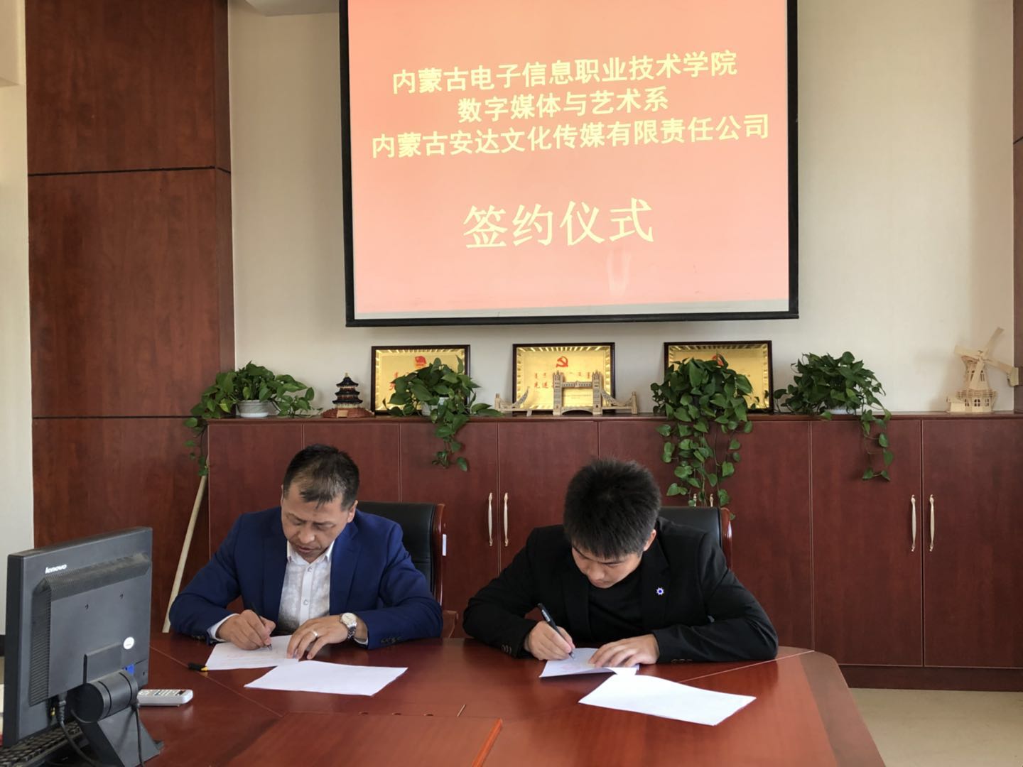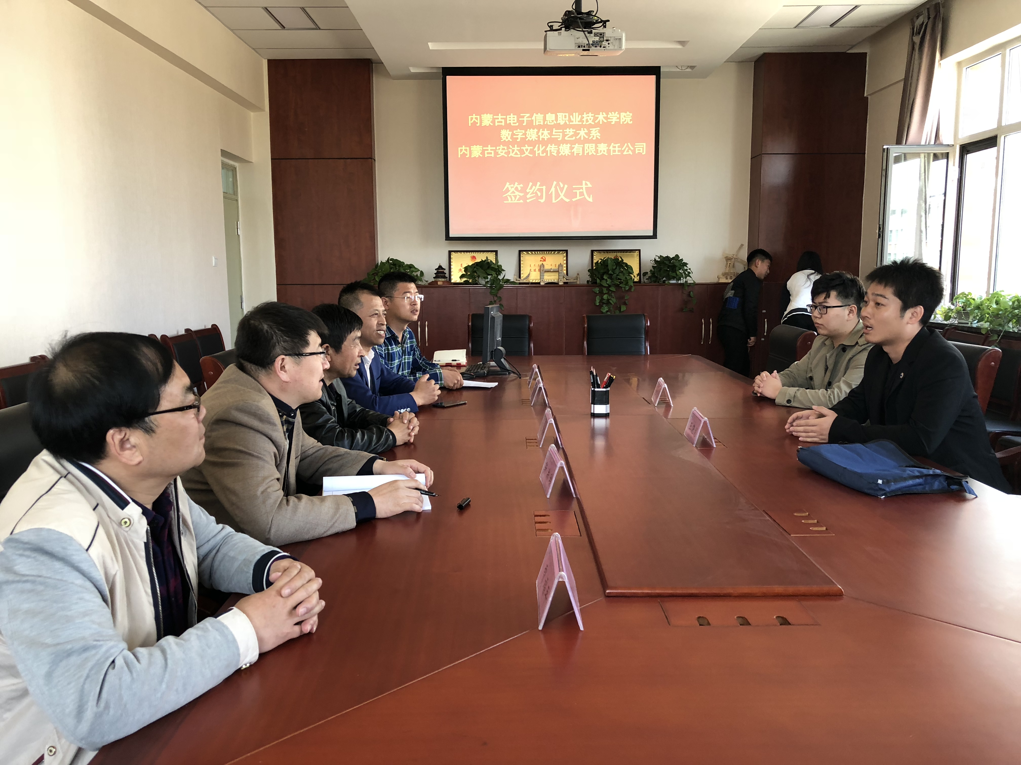 数字媒体与艺术系同内蒙古安达文化传媒有限责任公司在学院校企合作协议大框架下深入探讨,经过1个多月的积极准备,于4月26日上午,在教学楼C座三楼会议室下举行合作签约仪式。内蒙古安达文化传媒有限责任公司负责人王晓龙、学院就业处处长丛培林、副处长靳洪玲、数媒系党总支书记、主任李占岭、教学副主任石磊和分管创业就业工作负责人贾福平参加签约仪式。