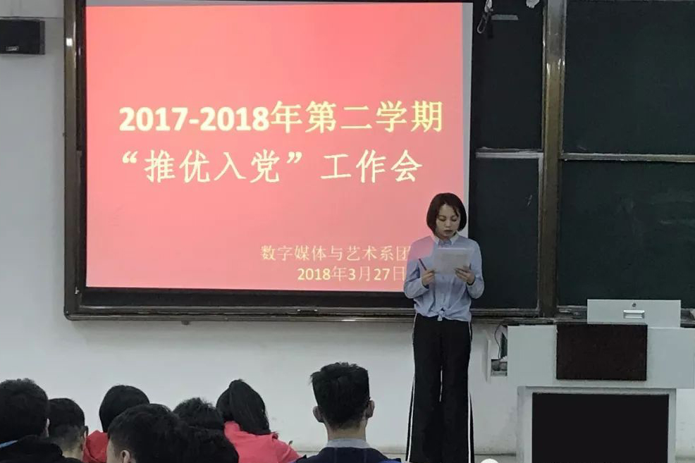 为培养和造就社会主义事业接班人、加强党员队伍建设、充实党的新生力量,也为响应学院团委本期推优入党工作要求。3月27日晚,在我系C106阶梯教室,召开了2018年上半年“推优入党”工作推进会暨学生干部座谈会。参加本次会议的有数字媒体与艺术系团总支梁术红老师、学生会组织部全体成员以及大一大二各班团支书、班长、组织委员、宣传委员。