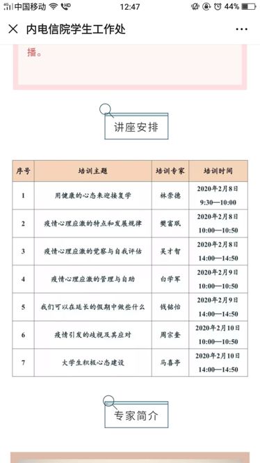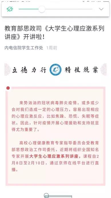 其次,组织全体学生在线学习来自我国高校心理健康教育专委会和思政司组织的《大学生心理应激系列讲座》,并要求记录每位学生在线学生情况。