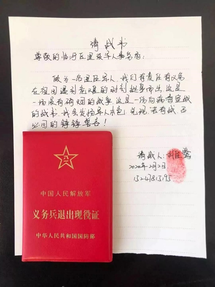 他说:“作为一名退伍军人,我们有责任有义务在祖国遇到危险的时刻挺身而出,这是一场没有硝烟的战争,这是一份向病毒宣战的战书,我会发扬军人本色,兑现‘若有战,召必回。回能战,战必胜’的铮铮誓言”。