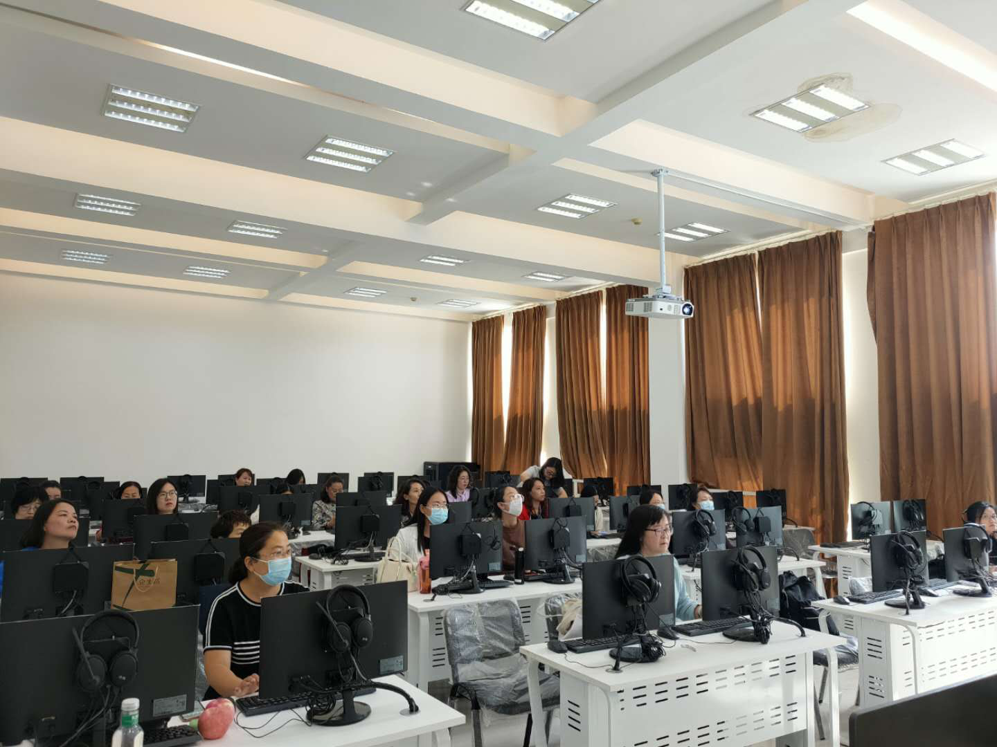 全体外语专兼职教师及外聘教师在一号语音室进行了设备使用培训,此次培训由来自外语教学与研究出版社的老师负责,就硬件设备的使用以及教学软件做了简单介绍。