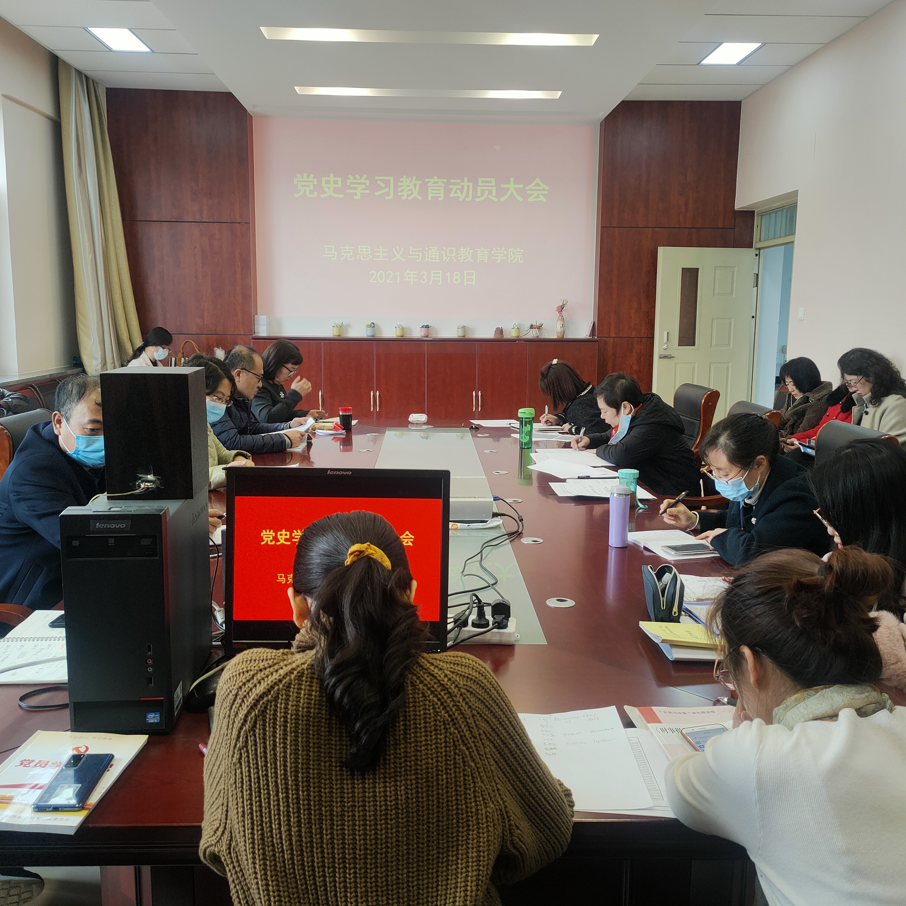 马克思主义与通识教育学院党总支分别于3月18日和4月1日召开党史学习教育动员大会和第一次党史学习教育会,深入学习贯彻习近平总书记在党史学习教育动员大会上的重要讲话精神和中央有关通知要求,以及自治区、学校党史学习教育动员大会精神和学校党史学习教育实施工作方案。党总支书记孟庆新主持会议,全体教职工参加动员大会。