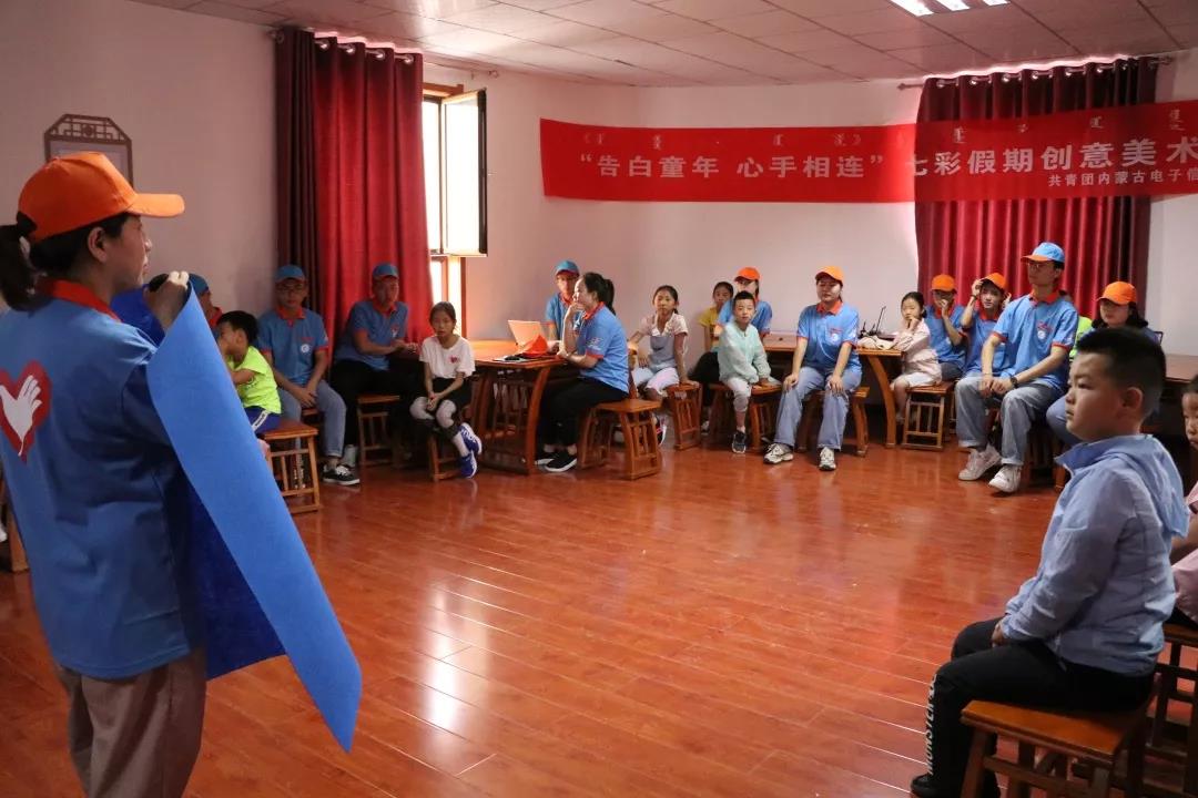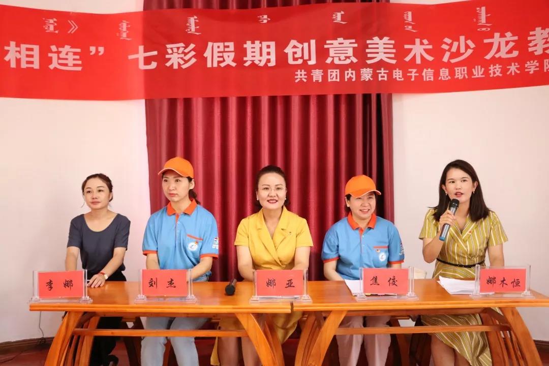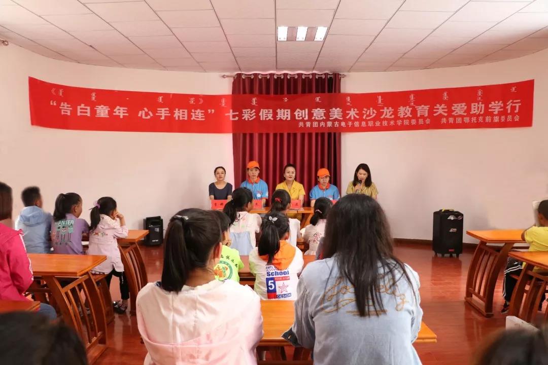 内蒙古电子信息职业技术学院志愿者布和都古仁带来了一首动听的蒙语歌曲——《雨》,拉开了仪式的帷幕。娜亚首先发表致辞,向远道而来的各位大学生志愿者以及提供志愿服务的内蒙古电子信息职业技术学院表示热烈的欢迎和衷心的感谢,同时,对参加活动的小学员们给予了热情的鼓励,希望他们通过此次活动收获更加充实的假期。之后,内蒙古电子信息职业技术学院校团委副书记焦佼介绍了本次“三下乡”活动的基本情况,她所带的队伍将在鄂托克前旗开展为期四天的社会实践活动,她表示作为今年三下乡的领队老师,将以认真严谨的态度带领青年学生做好社会实践活动,用最真挚的初心指导孩子们,帮助孩子们,陪伴孩子们,虽然时光短暂,但是一定是浓墨重彩的一段旅程。
