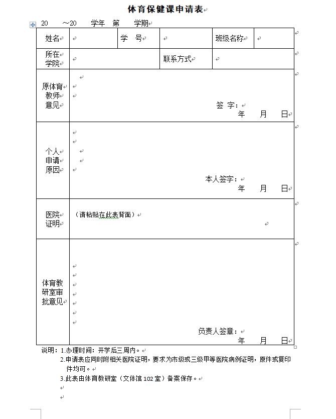 1、凡上体育保健课的学生须填写《内蒙古电子信息职业技术学院体育保健课申请表》一式两份(此表从体育教学部网站下载),同时附县(旗)级以上医院证明。