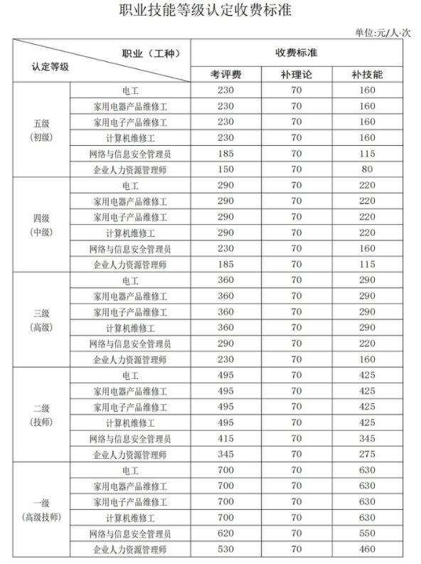 职业技能等级认定收费共分为两部分:职业技能培训和职业技能鉴定两部分。根据中华人民共和国《职业分类大典》(2015年版)分类,我校申请开展评价的职业(工种)为: