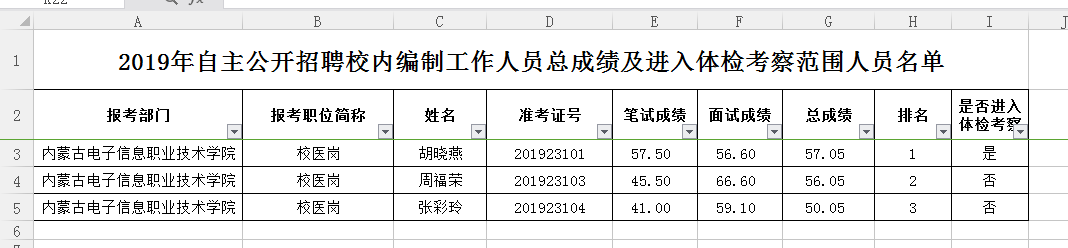 附件:内蒙古电子信息职业技术学院2019年自主公开招聘校内编制工作人员总成绩及进入体检考察范围人员名单