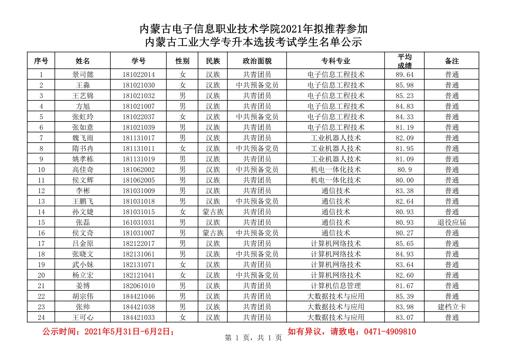 内蒙古电子信息职业技术学院2021年拟推荐参加内蒙古工业大学专升本选拔考试学生名单