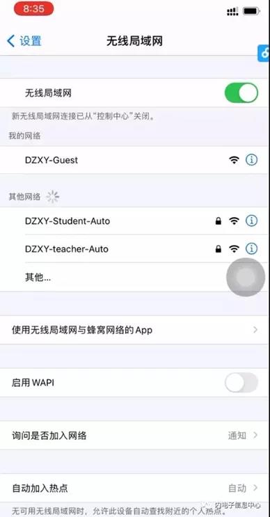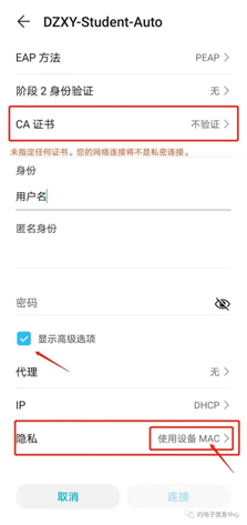 找到无线局域网设置选项,点击要连接的无线热点(教师用户选择DZXY-teacher-Auto热点,学生用户选择DZXY-Student-Auto热点),在输入帐号密码界面,勾选“显示高级选项”,点击“隐私”,选择连接“使用设备MAC”即可。