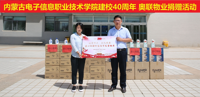 6月29日上午,奥联物业股份有限公司项目主管王天猛、公寓宿管主管李楠代表公司向内蒙古电子信息职业技术学院捐赠40箱洗手液和200个纪念杯,助力学校40周年校庆。党政办公室主任王凤岐、后勤处处长宋国松代表学校接受...